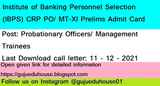 IBPS CRP PO/ MT-XI Prelims Admit Card 2021|IBPS PO Prelims Admit Card 2021|The Institute of Banking Personnel Selection (IBPS) CRP PO/ MT-XI Prelims Admit Card 2021|IBPS Admit Card |Institute of Banking Personnel Selection (IBPS) Admit Card|Common Recruitment Process (CRP) for Recruitment of Probationary Officers/ Management Trainees in Participating Banks (CRP PO/MT- XI)